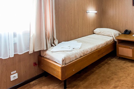 Одноместная каюта со всеми удобствами, расположенная на главной и верхней палубах. Площадь каюты ≈ 7,5 м². В каюте: односпальная кровать (вдоль стены), прикроватная тумба, телевизор со встроенным DVD, шкаф для одежды, ванная комната (раковина, душ, туалет) в одной зоне, фен, розетки 220V, прикроватный светильник, телефон (звонки по теплоходу), обогреватель.