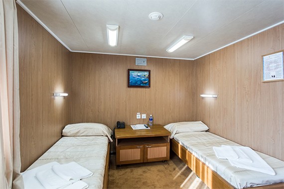 Двухместная каюта twin со всеми удобствами, расположенная на нижней палубе. Площадь каюты ≈ 9 м². В каюте: две раздельные одноместные кровати (параллельно вдоль стены), прикроватная тумба, телевизор со встроенным DVD, шкаф для одежды, ванная комната (раковина, душ, туалет) в одной зоне, фен, розетки 220V, прикроватные светильники, телефон (звонки по теплоходу), обогреватель.