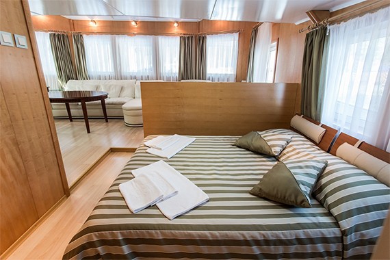 Двухместная каюта повышенной комфортности со всеми удобствами, расположенная на главной палубе. Площадь каюты ≈ 31 м². В каюте: двуспальная кровать, прикроватные тумбочки, прикроватные светильники, шкаф для одежды, угловой диван, два кресла, большой круглый стол, стулья, тумба под ТВ, телевизор, журнальный столик, DVD, ванная комната (джакузи, раковина, туалет), фен, розетки 220V телефон (звонки по теплоходу), обогреватель, кондиционер, мини-бар, обзорные окна.