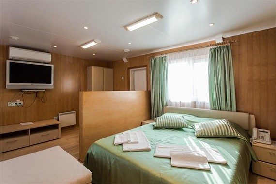 На борту представлены каюты теплохода разных категорий со всеми удобствами, от стандартных одно- и двухместных кают до двухкомнатных люксов площадью до 35 квадратных метров.