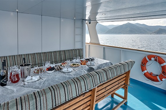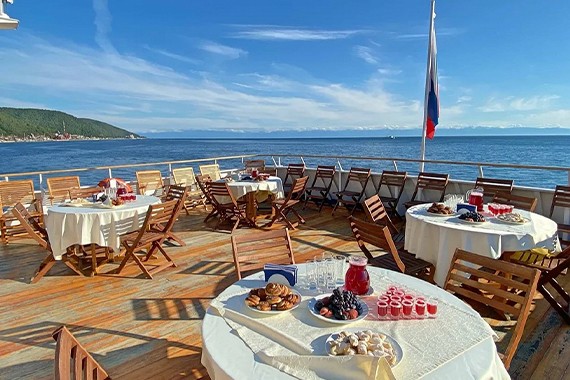 Питание осуществляется в ресторане, где гостям предлагаются завтраки, обеды и ужины, в том числе блюда байкальской кухни. В хорошую погоду для желающих столики могут быть сервированы на открытой палубе.