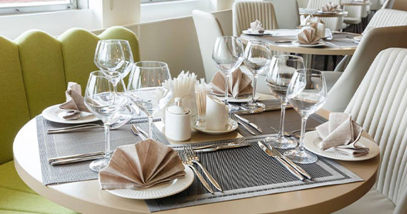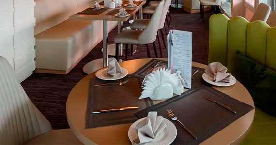 Ресторан работает по системе шведского стола на завтрак и заказного питания на обед и ужин — в первый вечер круиза вам принесут бланк меню на следующий день, где вы сможете сделать выбор из представленных блюд. По запросу вам может быть предоставлено спецпитание: вегетарианское, диетическое и любое другое в соответствии с вашими пожеланиями. С заботой о вашем здоровье мы разработали блюда меньшей калорийности. По многочисленным просьбам гостей мы предоставляем возможность выбора размера порций. Наши повара уделяют особое внимание предпочтениям юных гостей — вы всегда найдёте, чем накормить вашего ребёнка, не сомневаясь в качестве продуктов и соответствии особенностям детского рациона.