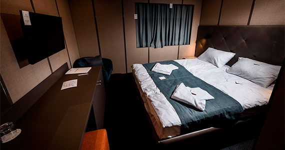 Однокомнатная одноярусная каюта с удобствами, рассчитанная на размещение двух человек. В каюте: двуспальная кровать, холодильник, минибар, сейф, телевизор, шкаф для одежды, радио, обзорное окно, душ, санузел, кондиционер, фен, сейф, электророзетка на 220V.