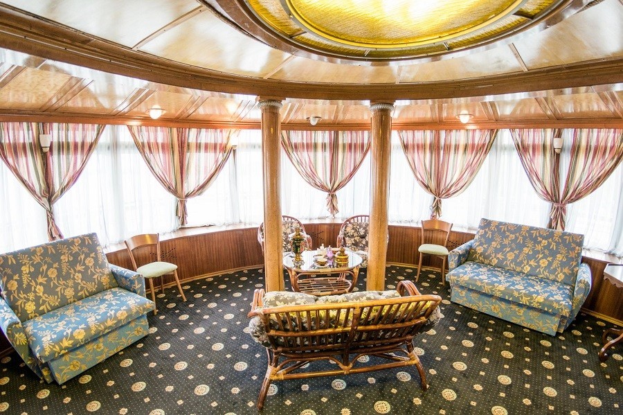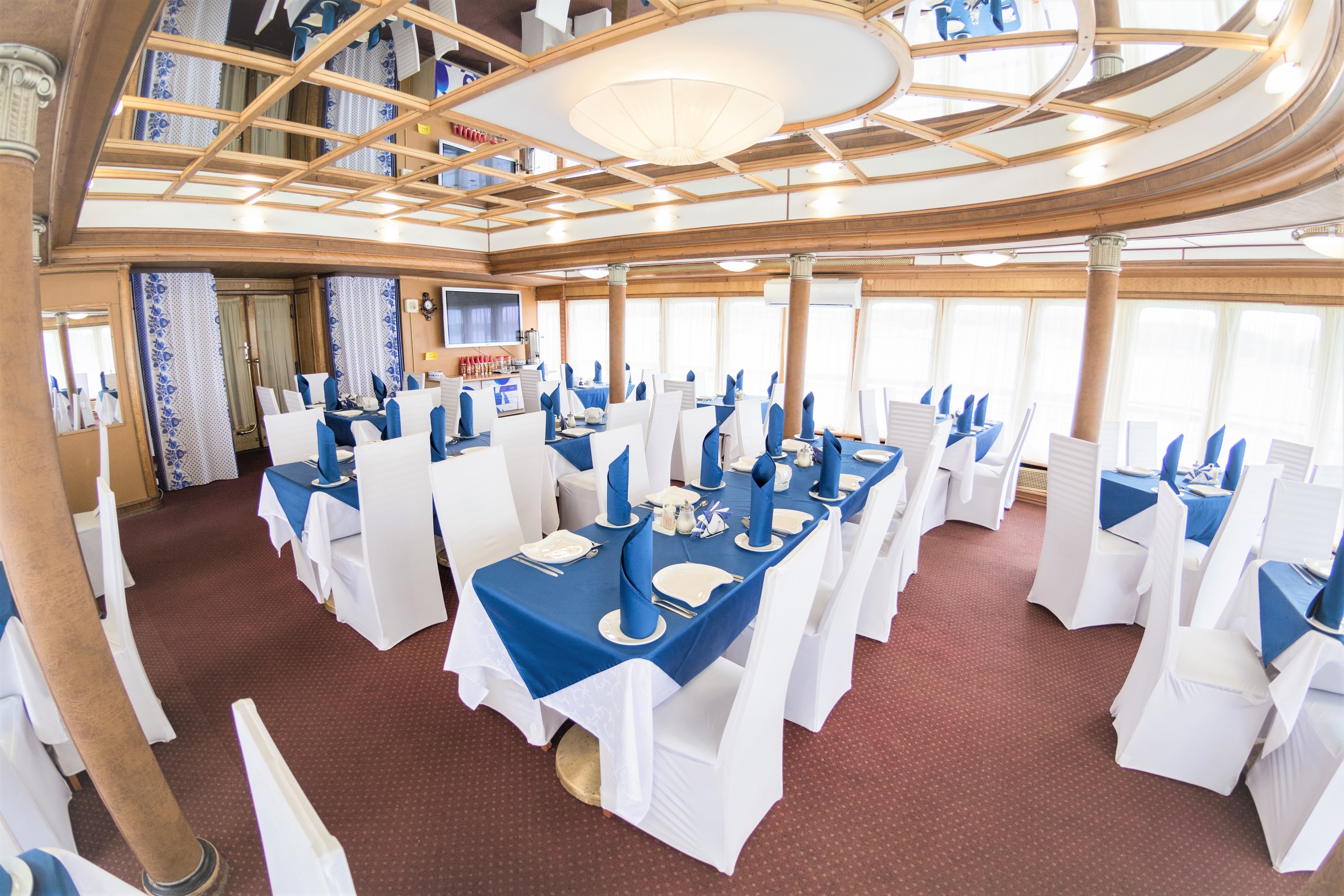 Питание на борту теплохода организовано в двух элегантных ресторанных салонах, расположенных на главной и шлюпочной палубах. Гостям предлагается заказное меню с разнообразными блюдами на завтрак, обед и ужин. В уютном баре можно провести время за бокалом напитка — в ассортименте широкий выбор как алкогольных, так и безалкогольных позиций.