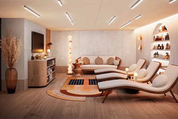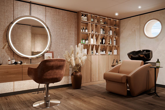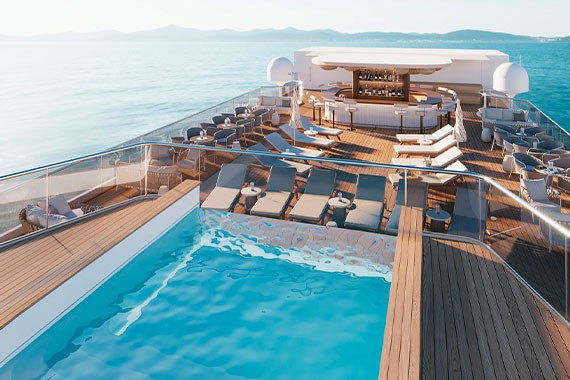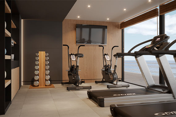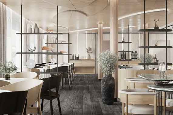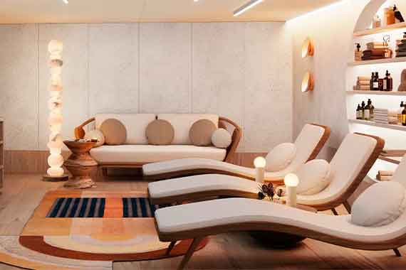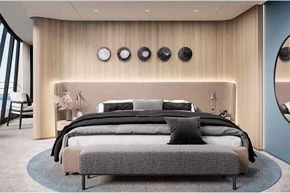 Для удобства гостей на борту общественные пространства и спальные зоны с каютами разделены. Стильный и лаконичный дизайн, цветовая гамма, сочетающаяся с небом и морем, элегантные атриумы с мягкой зоной, бесшумный лифт, плавные лестницы с подсветкой, панорамные окна – все это создает ощущение простора и комфорта.