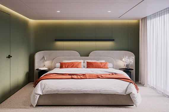 Оформление кают выполнено с использованием премиальных материалов. Эксклюзивный текстиль и удобные кровати помогут расслабиться и насладиться вашим путешествием в полной мере. Во всех каютах: шкаф для одежды, балкон или панорамное окно, кондиционер, душ, санузел, радио, розетка 220V, холодильник, капсульная кофемашина, электрочайник, телевизор (спутниковое ТВ), телефон, сейф, фен.