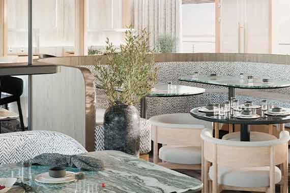 На шлюпочной палубе вы найдете просторный Ресторан, где каждая деталь создана для вашего удовольствия: Основная зона на 172 посадочных места, в которой благодаря остеклению в пол открывается великолепнейшая панорама проплывающих за бортом пейзажей. Веранда на 24 места, где можно наслаждаться гастрономическими вкусами на свежем воздухе. Приватная зона на 8 мест, которая идеально подходит для особого случая или частного мероприятия.