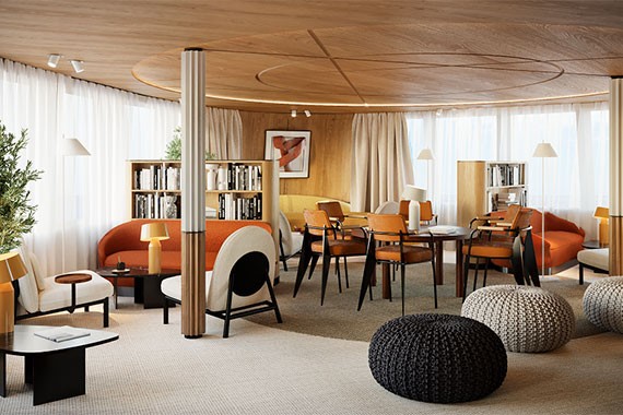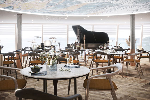 В Панорамном баре в корме шлюпочной палубы можно послушать музыкальные сеты или насладиться вкусным коктейлем. Здесь темные оттенки в сочетании с теплыми натуральными материалами создают особое настроение, а приглушенный свет помогает сделать атмосферу более расслабленной. У бара есть открытая терраса на 20 посадочных мест, которая позволит гостям продолжать музыкальный вечер на свежем воздухе — на площадке в корме за баром.