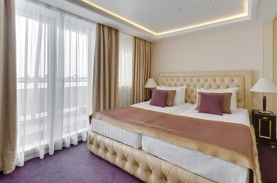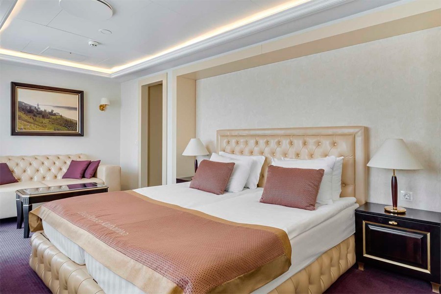 К категории Делюкс+ относятся каюты: 427, 428. Двухместная каюта с балконом и со всеми удобствами, расположенная на шлюпочной палубе. Площадь каюты ≈ 18,6 м². Площадь балкона ≈ 10 м². Размер кровати – 160х200 см. Доступ к Wi-Fi предоставляется без ограничения трафика. Возможно размещение третьего человека (ребенок до 14 лет включительно) на дополнительном спальном месте – еврораскладушка.