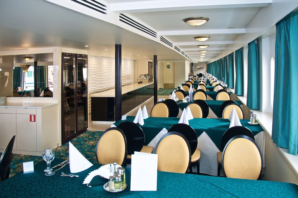 На борту есть все для приятного отдыха: ресторан и бар с панорамными видами, бар на солнечной палубе, парикмахерская, сувенирный магазин и кабинет врача.