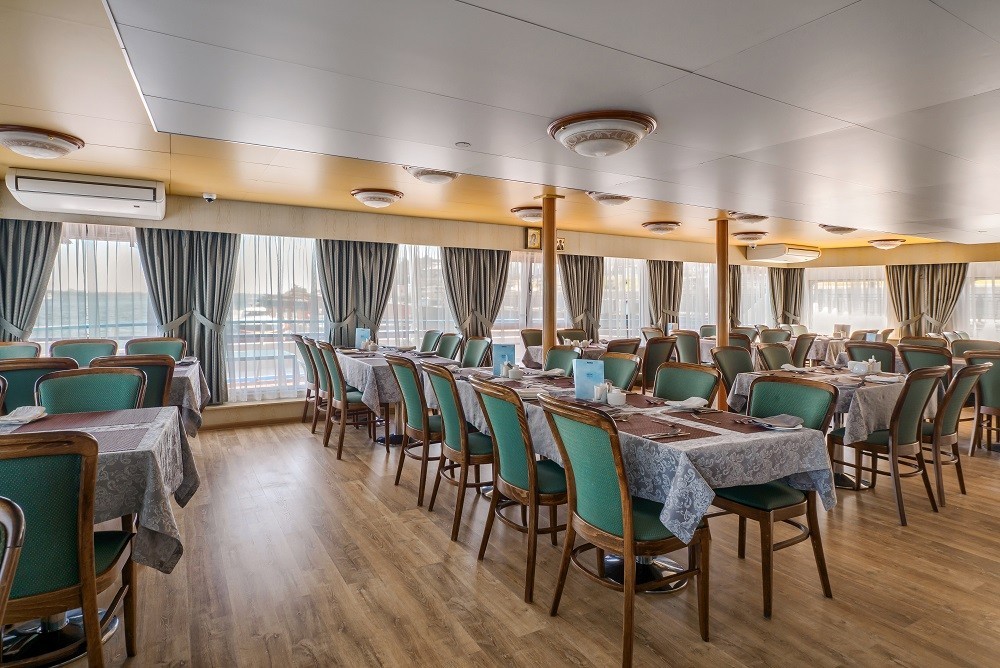 На борту теплохода вас встретит просторный и элегантный ресторан, расположенный на средней палубе. Трижды в день здесь будут подаваться изысканные блюда, созданные шеф-поваром компании «Созвездие». Завтрак в каюту – услуга, включенная в стоимость для всех туристов.