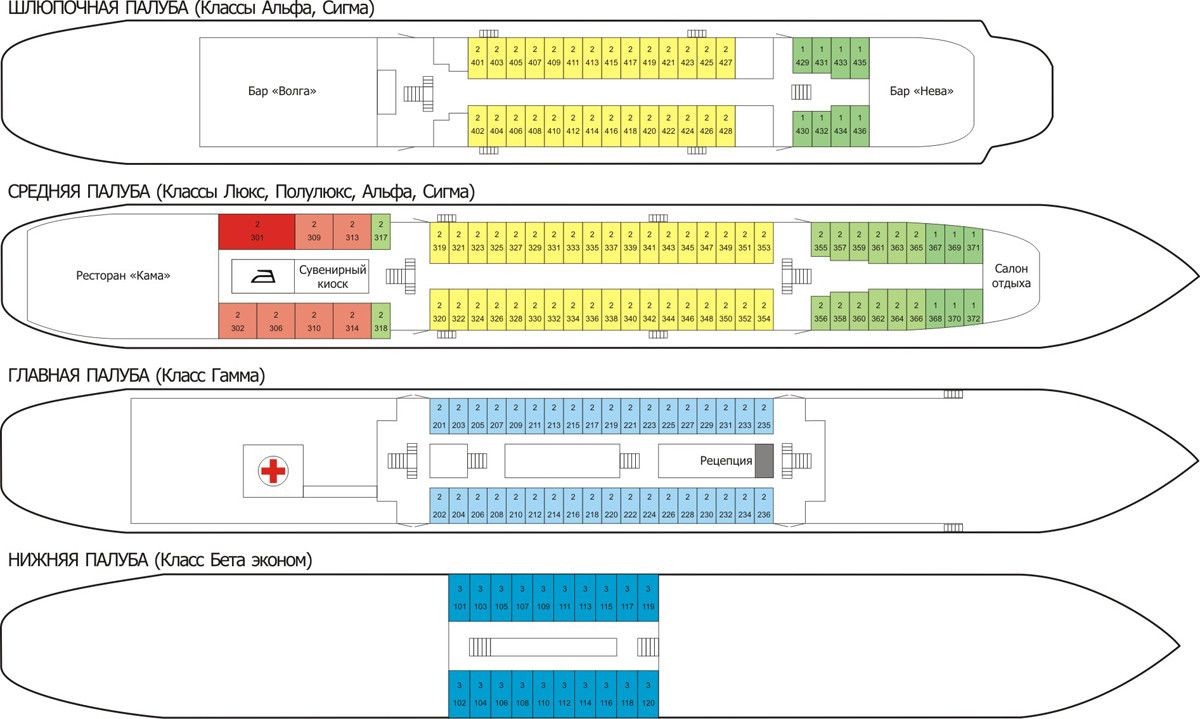 На теплоходе 155 кают разных категорий: 1 каюта класса «Люкс», 6 кают класса «Полулюкс», 14 одноместных кают класса «Сигма», 100 двухместных одноярусных кают классов «Альфа», «Гамма», 14 двухместных двухъярусных кают класса «Сигма», 20 трёхместных одноярусных кают класса «Бета». Во всех каютах: шкаф для одежды, радио, кондиционер, холодильник, душ, санузел, обзорное окно (на нижней палубе — иллюминаторы), розетка 220V.